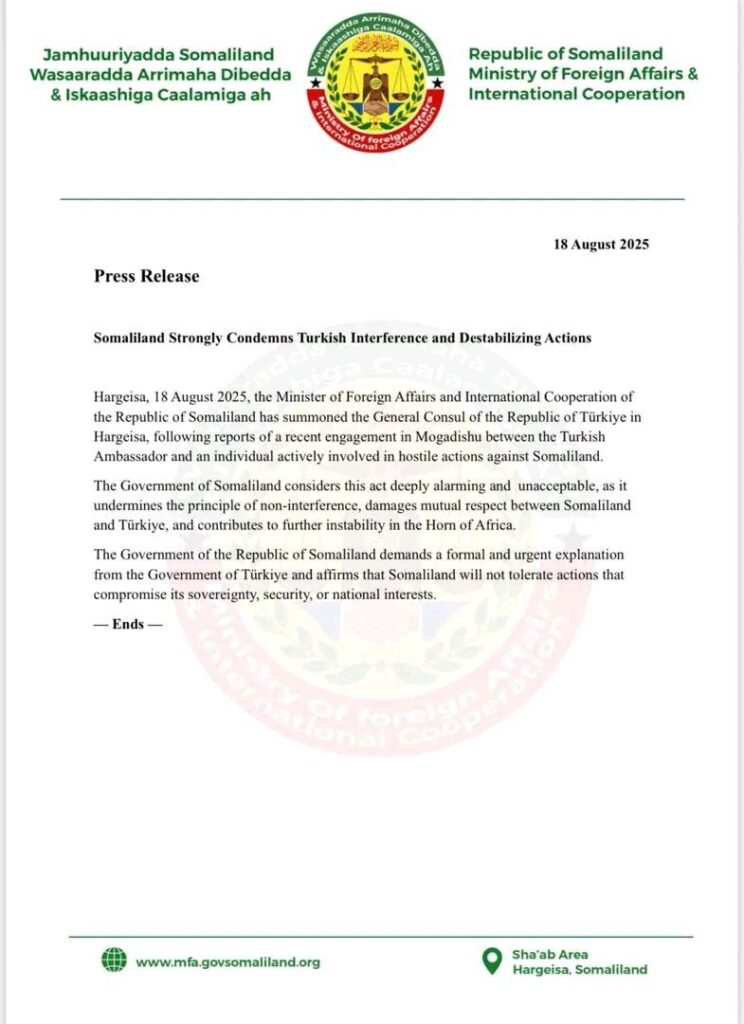 Hargeysa, 18 Ogost 2025 – Wasaaradda Arrimaha Dibadda iyo Iskaashiga Caalamiga ah ee Jamhuuriyadda Somaliland ayaa maanta si adag u cambaaraysay tallaabo ay ku tilmaantay faragelin aan la aqbali karin oo ka timid Dawladda Turkiga.