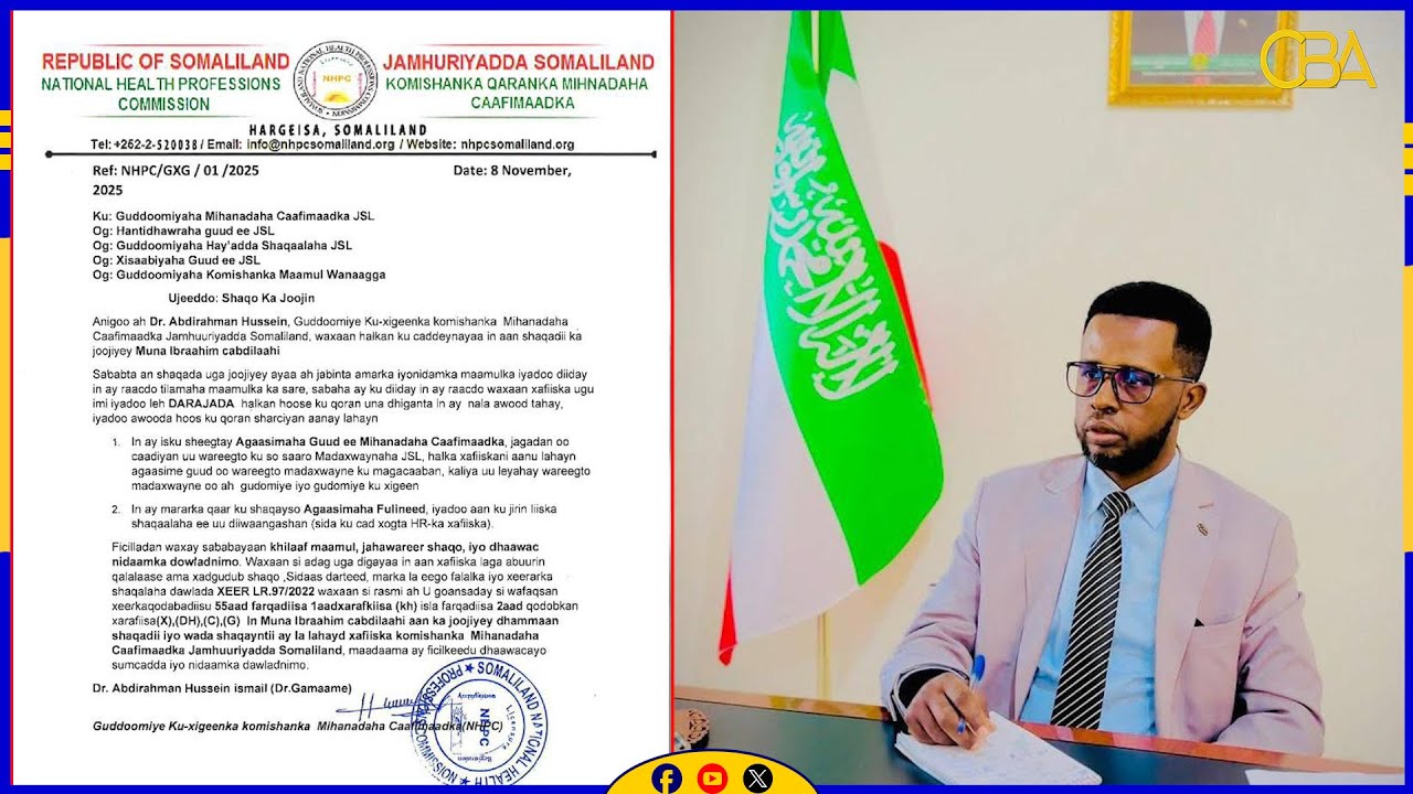 HomeWararka ugu WaweynSomaliland shaqaale sheegtay Agaasime guud oo shaqadii laga joojiyey. Somaliland shaqaale sheegtay Agaasime guud oo shaqadii laga joojiyey. By Warda November 9, 2025 0 Comments Related Articles Warbixino Dheeraad ahMarch 6, 2026 Haayadda Xuquuqda Aadanaha Dunida ee Amnesty International ayaa muujisay xadgudubyo culus oo ka dhacay Deegaanka Oromada Itoobiya. Wararka ugu WaweynMarch 4, 2026 Agaasimaha Guud ee Wasaaradda Maaliyadda iyo Horumarinta Dhaqaalaha Jamhuuriyadda Somaliland Md.. Wararka ugu WaweynMarch 4, 2026 Baarlamaanka Federaalka Soomaaliya oo ansixiyay dhammeystirka dib u eegista Dastuurka Dalka More in Warbixino Dheeraad ah 02:53 Sheeko-maanseed:- Saddex dibi oo saaxiib ah.Qiso cajiib ah. November 24, 2023